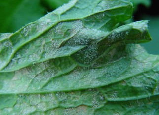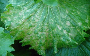 發(fā)病癥狀:主要為害葉片,最初葉正面出現(xiàn)淡黃色或黃綠色周緣不明顯的病斑,后擴大變?yōu)辄S褐色病斑。病斑因受葉脈限制而呈多角形或不規(guī)則形,葉背密生白色霜狀霉。