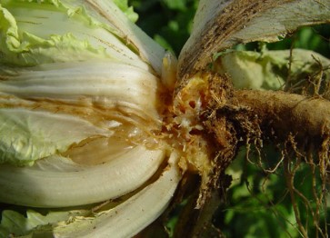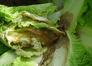 也有少數(shù)菜株外葉濕腐,干燥時爛葉干枯呈薄紙狀緊裹住菜球,俗稱“燒邊”,或菜球內(nèi)外葉良好,只是中間菜葉自邊緣向內(nèi)腐爛,俗稱“夾心爛”。